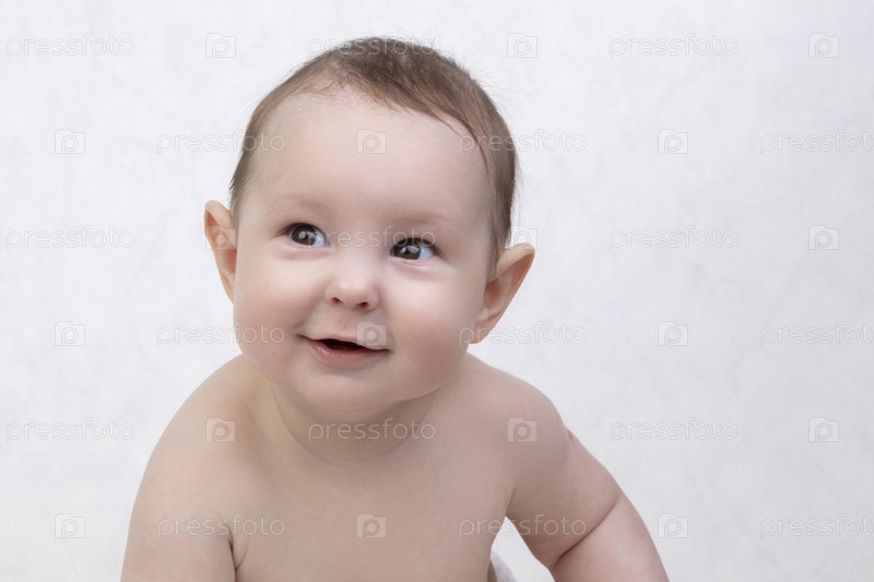 Шестимесячный ребенок на белом фоне. Счастливый мальчик в середине диапазона. Концептуальное фото отцовства и материнства. Альфа-поколение