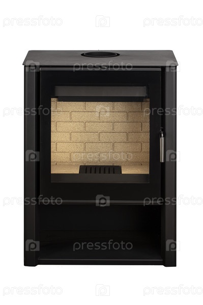 Современные камины для отопления из металла и жаропрочного стекла. Котел на твердом топливе изолирован на белом фоне