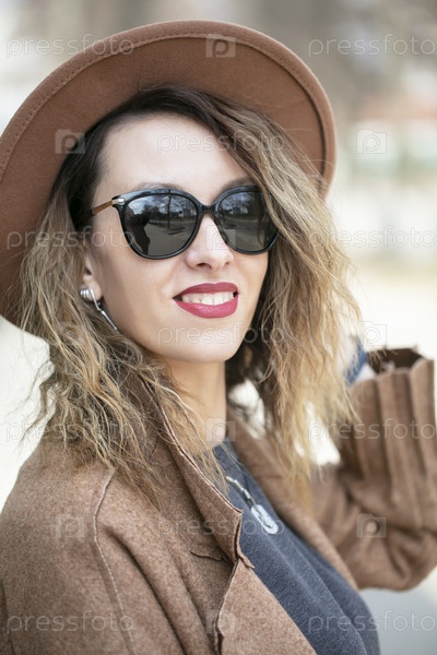 Красивая девушка в бежевой элегантной шляпе и солнцезащитных очках на улице