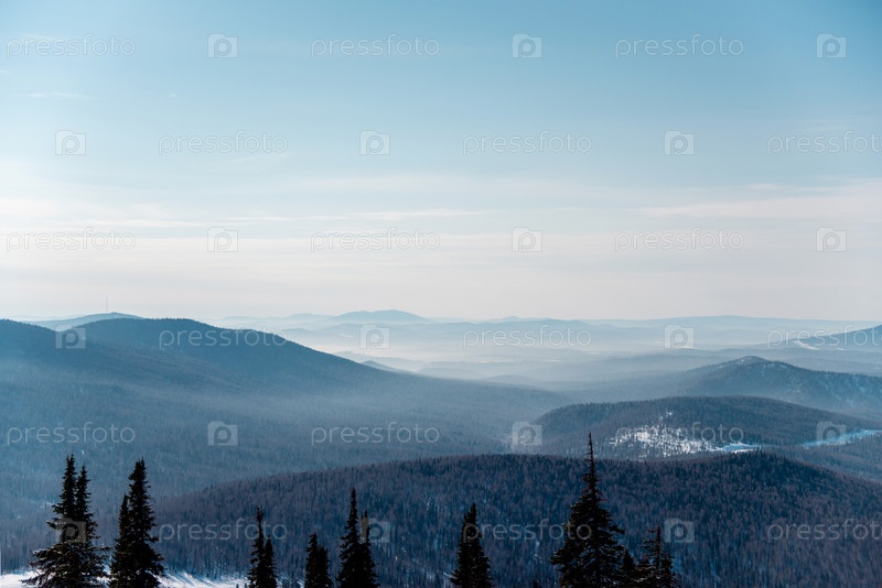 Пейзаж заснеженных гор, горный хребет в дымке зимой