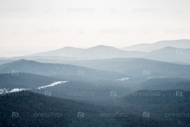 Пейзаж заснеженных гор, горный хребет в дымке зимой