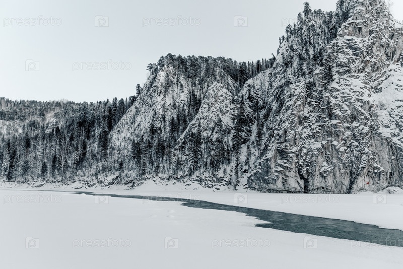 Пейзаж заснеженных гор, горный хребет в дымке зимой
