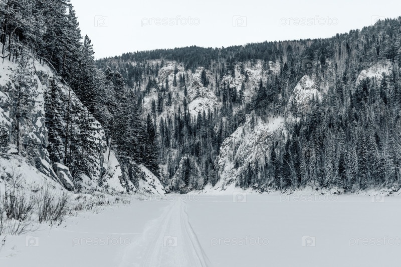 Пейзаж заснеженных гор, горный хребет в дымке зимой