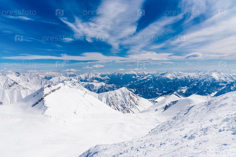 Пейзаж заснеженных гор, горный хребет в дымке зимой