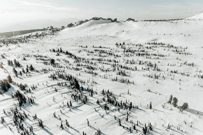 Пейзаж заснеженных гор, горный хребет в дымке зимой