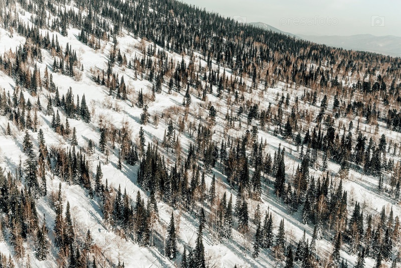 Пейзаж заснеженных гор, горный хребет в дымке зимой
