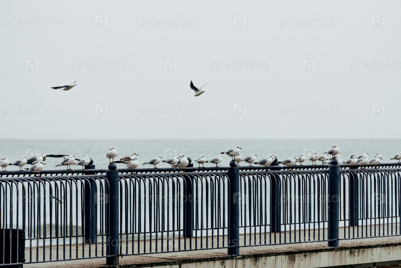 Чайка рядом с морской водой, чайки сидят на перилах на фоне океана
