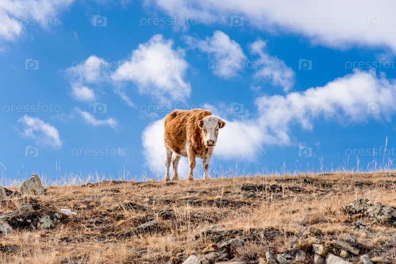 Корова ест желтую траву на лугу, стадо коров пасется в поле осенью, сельскохозяйственные животные