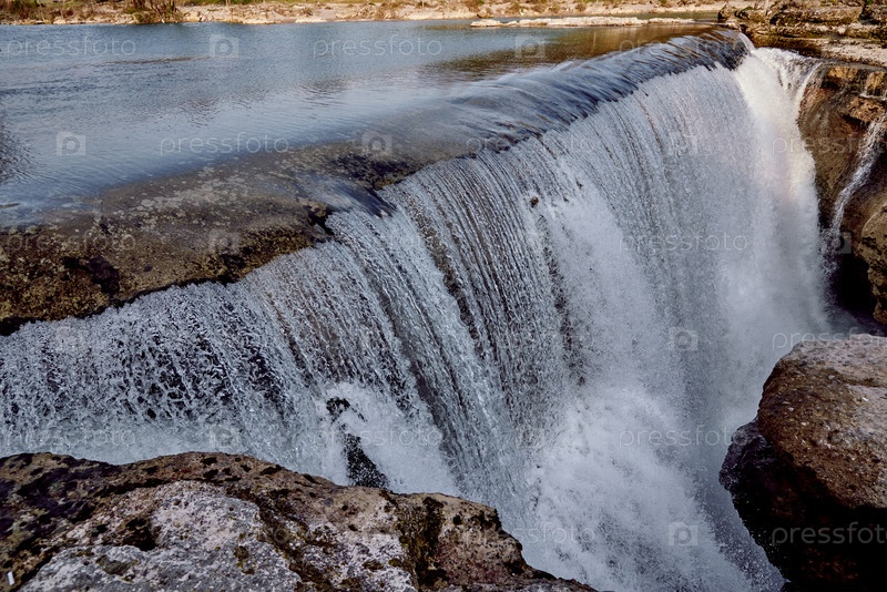 Пейзаж реки среди камней, быстрое течение воды в водохранилище при свете дня