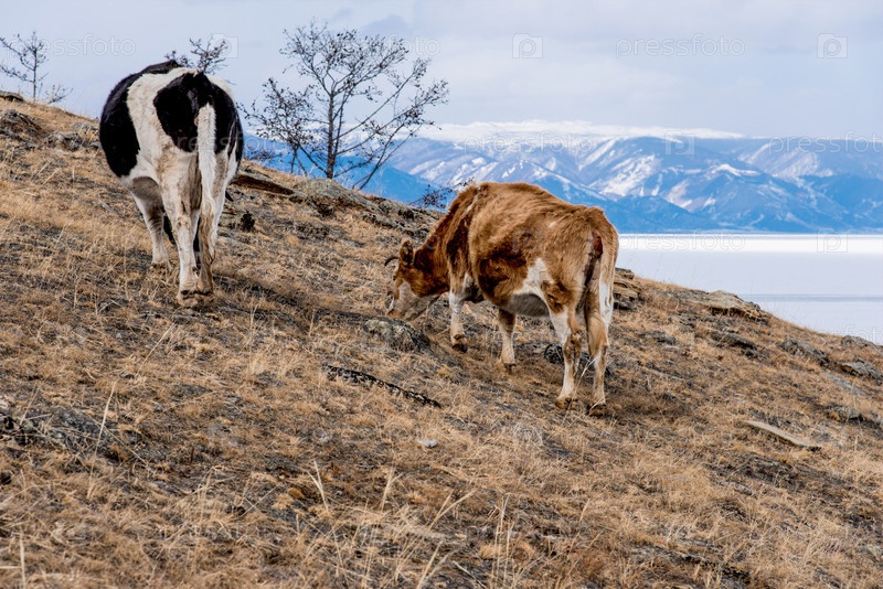 Корова ест желтую траву на лугу, стадо коров пасется в поле осенью, сельскохозяйственные животные