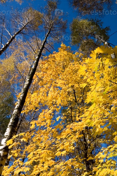 Желтые листья клена на темно-синем небе