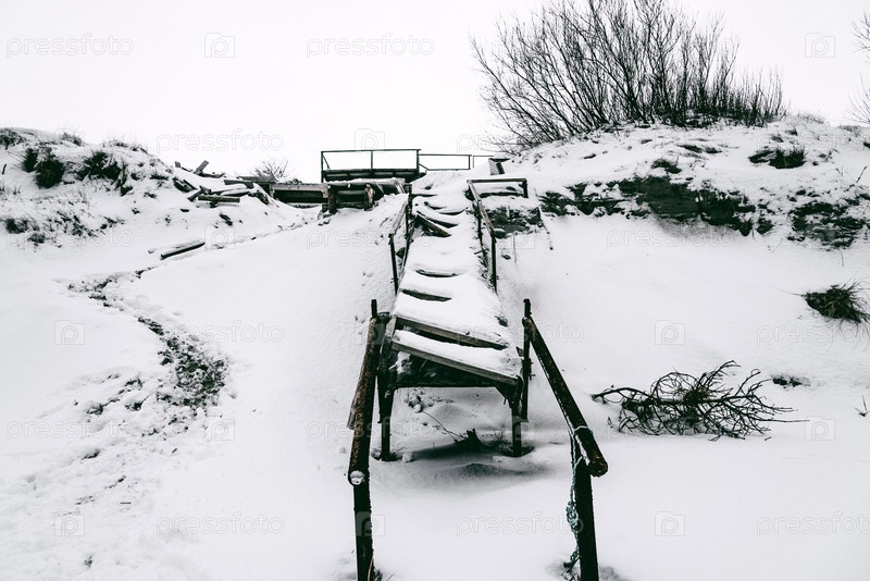 Старая деревянная лестница в городском парке, лестница на фоне снега зимой