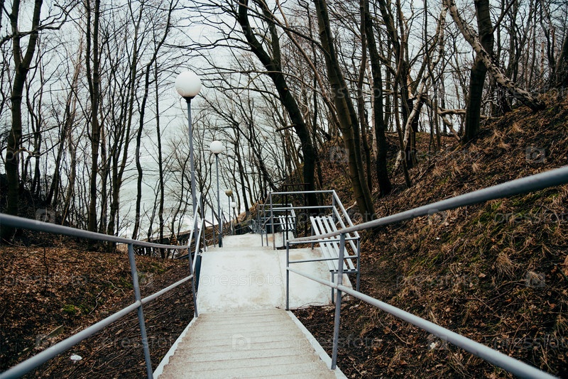 Длинная бетонная лестница, спускающаяся с горы к морю, осенний пейзаж в городском парке