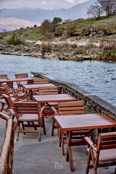 Кофейня на открытой террасе, пустынная веранда с видом на морской пейзаж