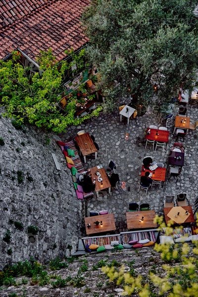 Кофейня на открытой террасе, люди обедают на веранде ресторана, городской пейзаж