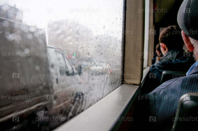 Мужчины едут в автобусе по дождливому пасмурному городу, мужчина сидит на сиденье, капли стекают по стеклу