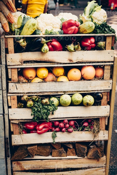 Спелые овощи и фрукты на ферме, лежащие в вертикальной деревянной корзине, продуктовый магазин