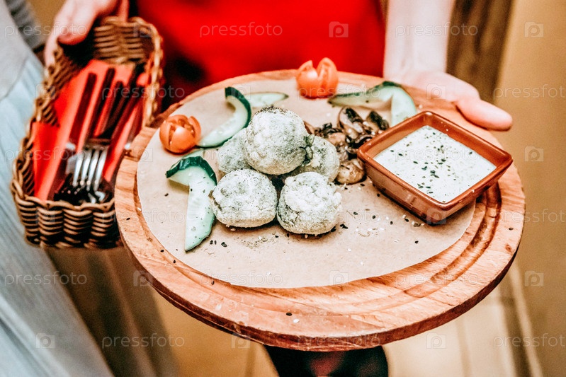 Итальянское блюдо в стеклянной тарелке на деревянном столе сырный шарик обед в ресторане
