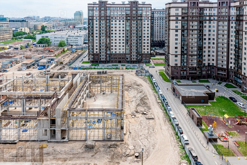 Строительная площадка, строительство многоэтажного жилого дома в городе, вид сверху на фундамент и балки