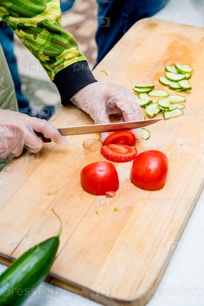 Шеф-повар в ресторане на кухне готовит овощной салат, крупным планом руки режут помидоры и огурцы на разделочной доске