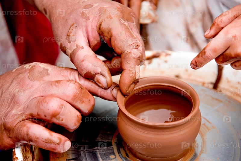 Гончар лепит кружку из глины, крупный план грязных рук, создающих вазу на керамическом круге