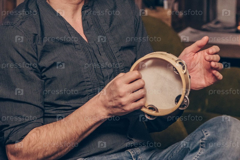 Мужчина играет на тамбурине, музыкант-бубенщик выступает на концерте в ночном клубе-баре