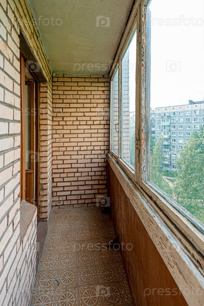 Интерьер старого крытого балкона жилого дома, лоджия под реконструкцию