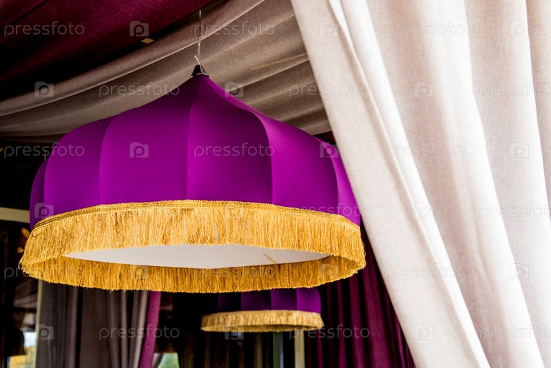 Интерьер летней веранды кофейни, дизайн ресторана в восточном стиле с большими тканевыми люстрами
