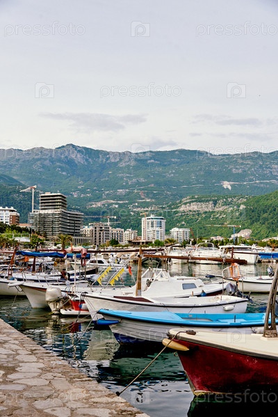 Стоянка яхт в морском порту, лодки в воде озера, пейзаж пристани для яхт в пасмурный день