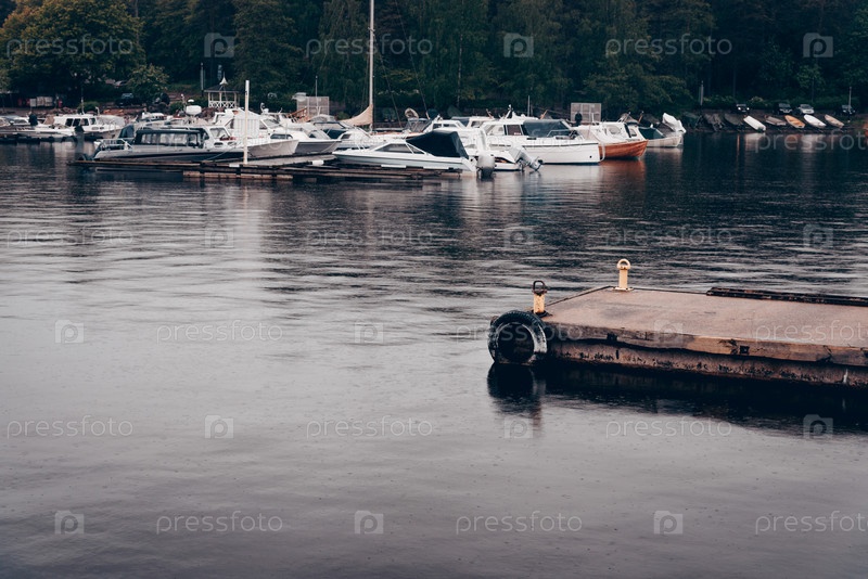 Стоянка яхт в морском порту, лодки в воде озера, пейзаж пристани для яхт в пасмурный день