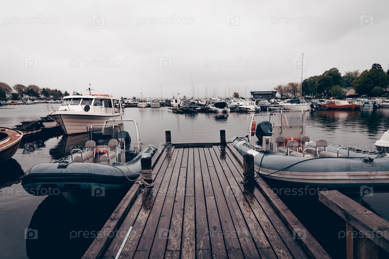 Стоянка яхт в морском порту, лодки в воде озера, пейзаж пристани для яхт в пасмурный день