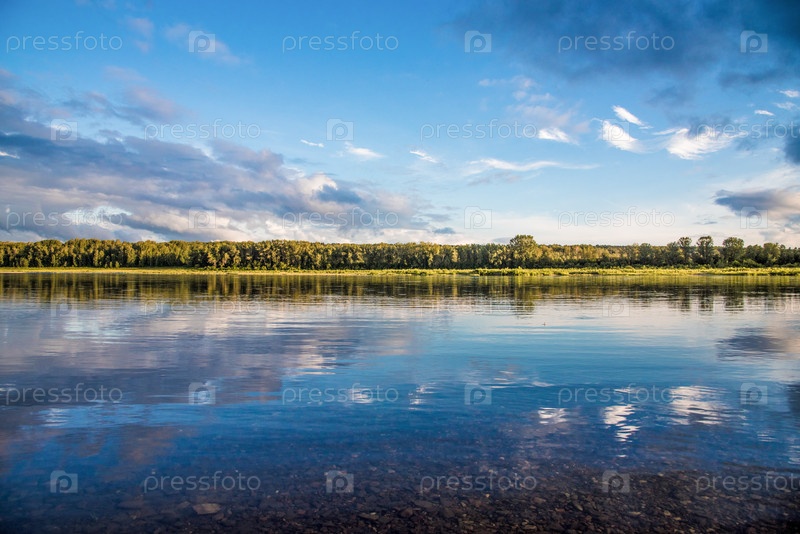 Пейзаж синего глубокого озера в свете солнца днем, облака в небе