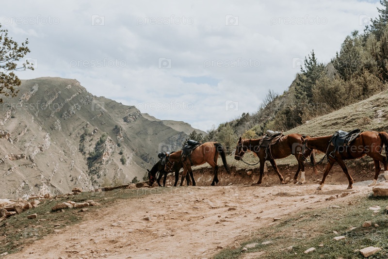 Табун запряженных лошадей, идущих по засушливой местности, верховая езда на отдыхе летом