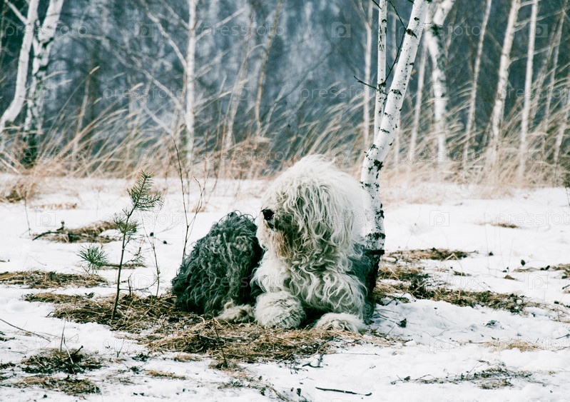 Милые пушистые собаки гуляют на улице снежной зимой, забавные питомцы играют друг с другом