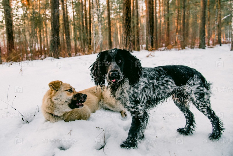 Милые пушистые собаки гуляют на улице снежной зимой, забавные питомцы играют друг с другом