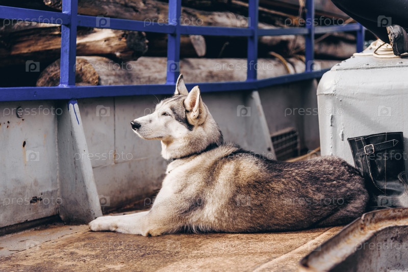 Милая собака-мопс сидит на полу корабля и смотрит вдаль, питомец отдыхает