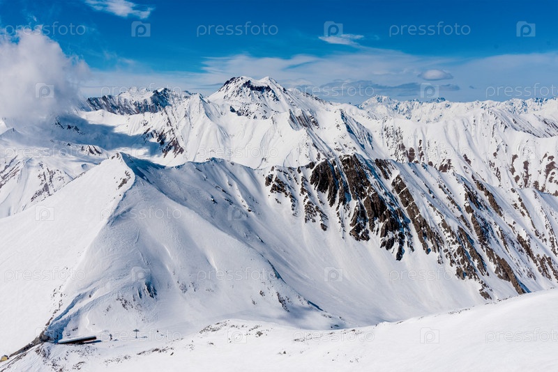 Пейзаж заснеженных гор, горный хребет в дымке зимой