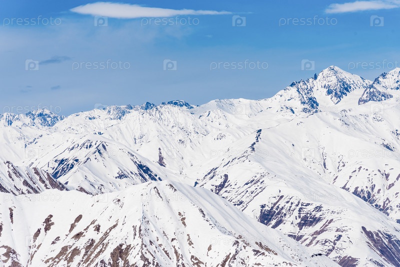Пейзаж заснеженных гор, горный хребет в дымке зимой
