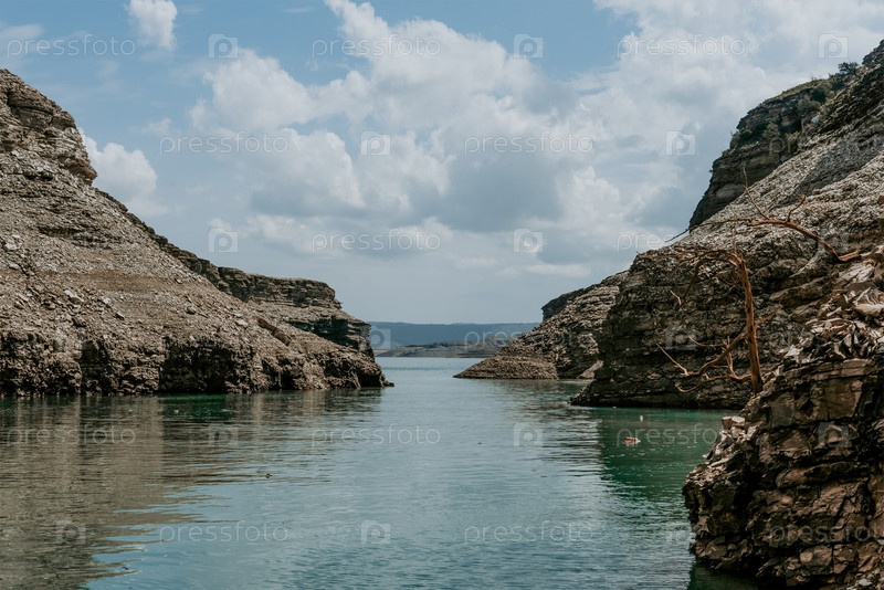 Пейзаж синего глубокого озера в свете солнца днем, облака в небе