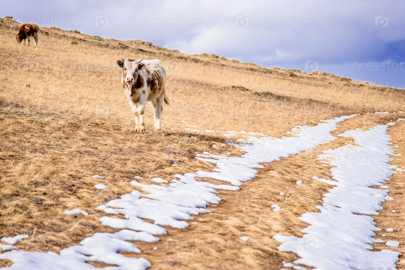 Корова ест желтую траву на лугу, стадо коров пасется в поле осенью, сельскохозяйственные животные