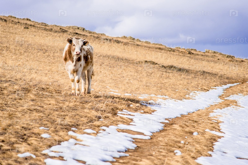Корова ест желтую траву на лугу, стадо коров пасется в поле осенью, сельскохозяйственные животные