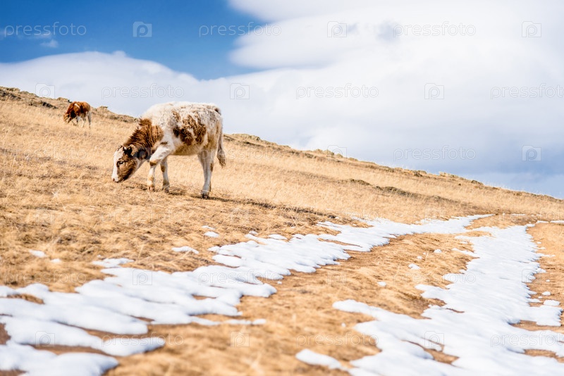Корова ест желтую траву на лугу, стадо коров пасется в поле осенью, сельскохозяйственные животные