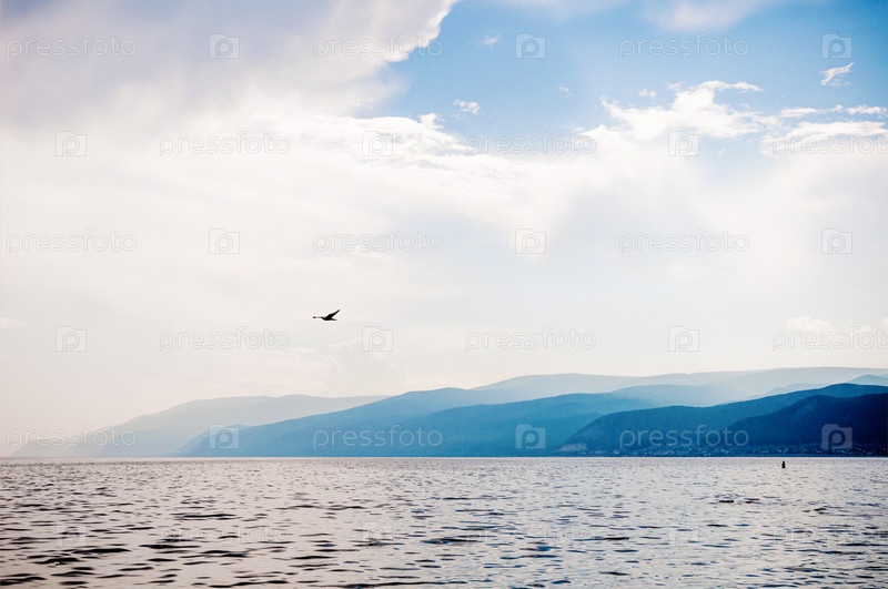 Пейзаж синего глубокого озера в свете солнца днем, облака в небе