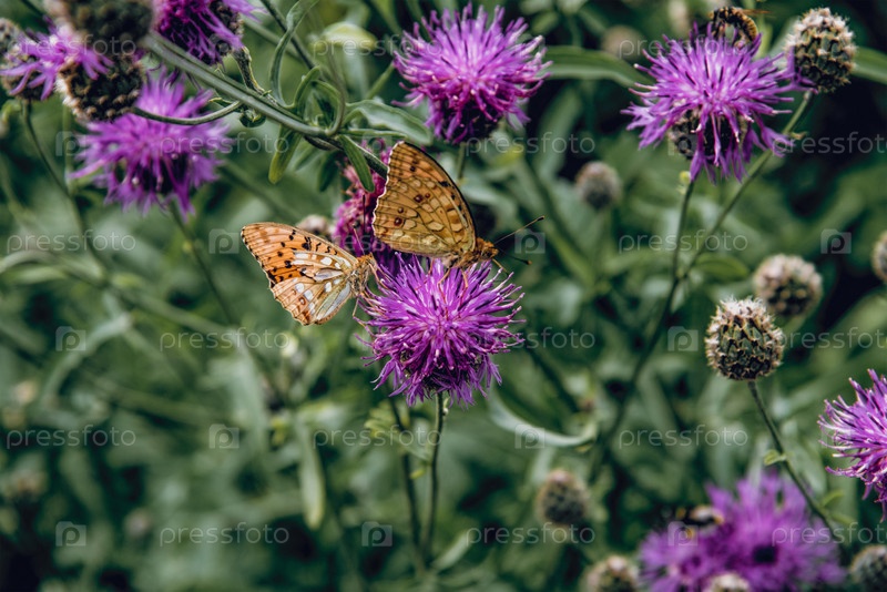 Пейзаж Зеленые растения густой лес, бабочка сидит на фиолетовом цветке на открытом воздухе