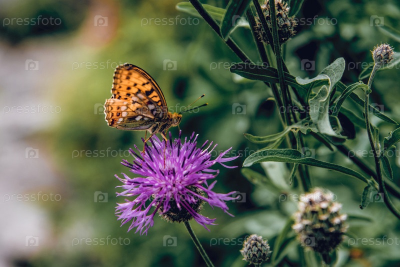 Пейзаж Зеленые растения густой лес, бабочка сидит на фиолетовом цветке на открытом воздухе