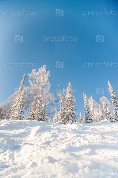 Белый зимний лесной пейзаж, заснеженные деревья и облачное небо, яркий солнечный день