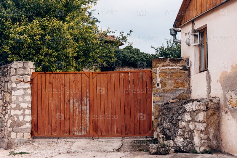 Деревянные ворота в загородном домике, коттедже в деревенском ландшафте