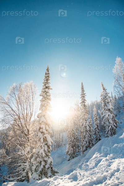 Белый зимний лесной пейзаж, заснеженные деревья и облачное небо, яркий солнечный день