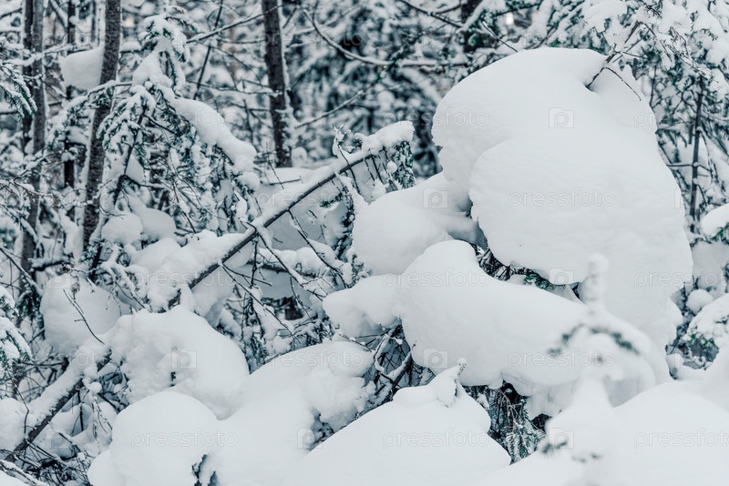 Белый зимний лесной пейзаж, заснеженные деревья и облачное небо, облачный туманный день