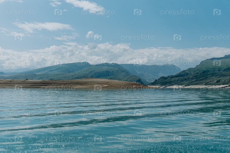 Пейзаж синего глубокого озера в свете солнца днем, облака в небе